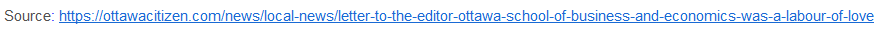 We created The Ottawa School of Business and Economics with the hope of being able to provide a highly valued service – higher education – for free, as most of us had benefited from access to free postsecondary education. We never sought profit from this operation, and, as such, never charged anyone for the services they received. On the contrary, our free service was a labour of love, which required thousands of hours of work and significant personal financial resources from team members. Unfortunately the negative publicity we received from Ottawa Citizen and Spears derailed the project. Some former members of the project now see it as a liability, bad feelings have arisen, and others have lost paid employment as a result of these irresponsible articles. For these reasons, we have seen no other option than to terminate the project.